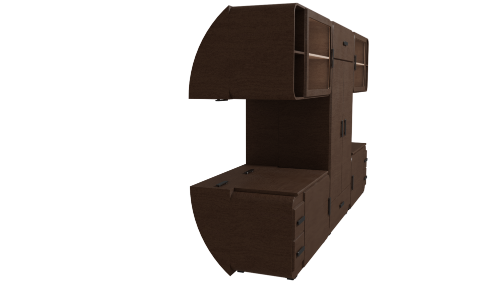 Modular dark wood dining room furniture created in Blender 2.93 and textured in Substance Designer. The model mesh has been optimized to not overload the rendering memory, without sacrificing visual quality and functionality. All parts have been separated into objects in order to be easily animated.